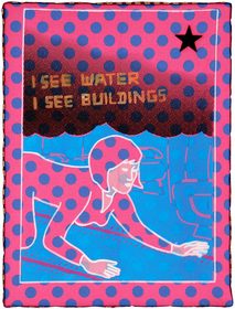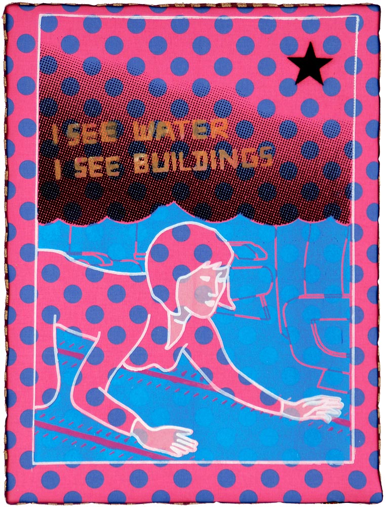 Voice mail from a flight attendant just before crashing into the Twin Towers on 9/11. Silkscreen on fabric, black star, ribbon, 46 x 61 cm. More on Airco Caravan.