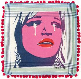 Silkscreen on handkerchief, diamonds, personal embroidery, ribbon, foamrubber, 26 x 26 x 5 cm. More on Airco Caravan.