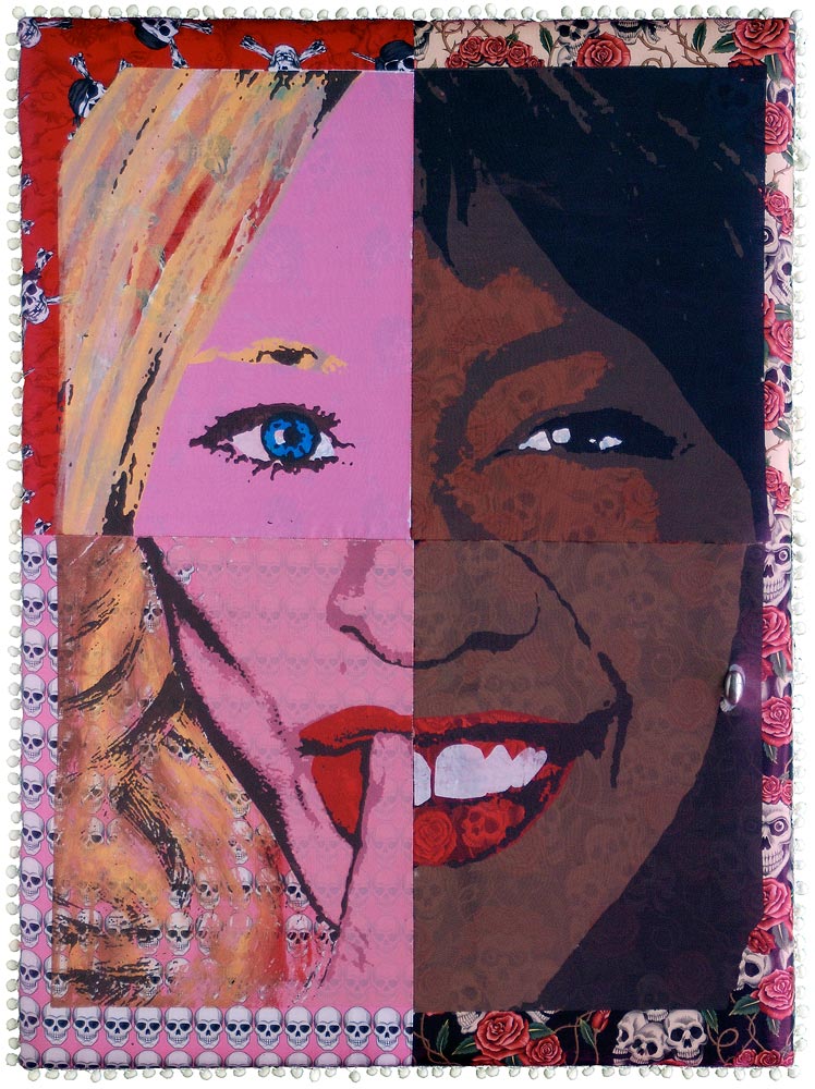 Portrait of JK Rowling, Oprah, Madonna and Condoleezza Rice. Silkscreen on 4 skull fabrics, silver earring, pink voile, ribbon, 85 x 116 cm, exhibited in New York. More on Airco Caravan.