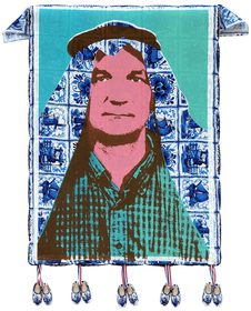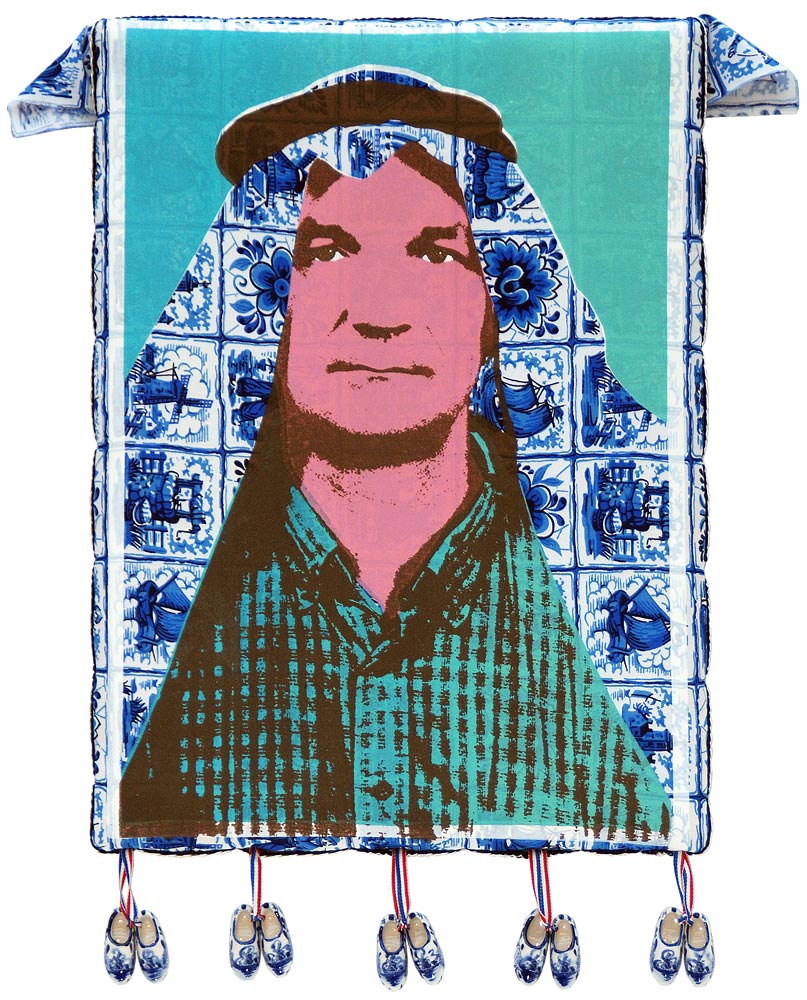 Silkscreen on Delft blue fabric, 5 pairs of porcelain wooden shoes hanging down, ribbon, 52 x 65 cm. More on