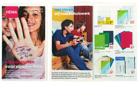 Veel retailers kijken maar al te graag de kunst af van HEMA. De nieuwe folderlijn is ontworpen door Koeweiden Postma, de advertising komt van Doom & Dickson. Gouden combinatie. Dit hoge niveau wordt in elke folder weer bestendigd en elke folder heeft een ander thema. De weer-naar-school-brochure staat vol met eigengereide tieners.