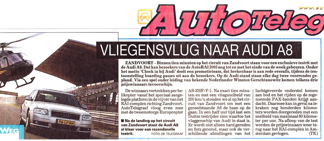 Ook journalisten vonden het hartstikke leuk om een stukje te vliegen. Voorafgaand aan de AutoRAI kregen ze een retourtje Zandvoort aangeboden en vervolgens stonden de kranten er vol mee. Mooie publiciteit! Goed voor een eervolle vermelding bij de Gouden Giraffe.