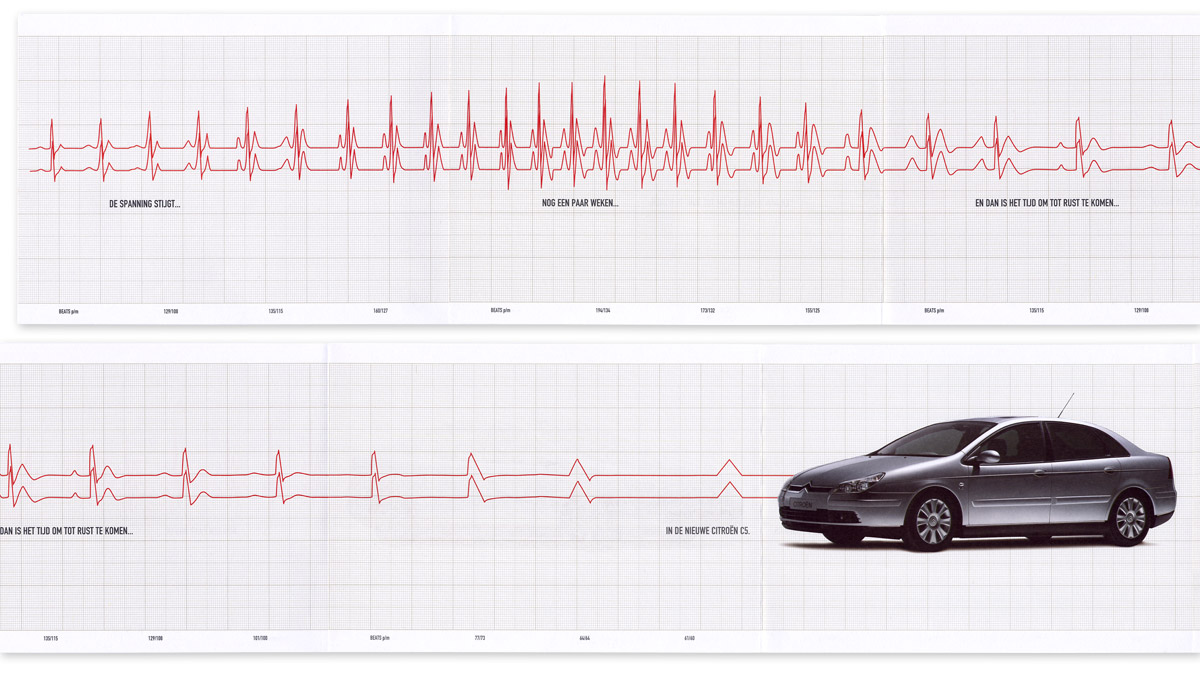 De folder van de nieuwe Citroën C5 in de vorm van een ECG print doet je hart sneller kloppen. De opwinding neemt toe. De hartslag stijgt. Je ziet het hartritme oplopen tot ongekende hoogte, totdat je, na anderhalve meter folder, bij het zien van de nieuwe Citroën C5 volledig tot rust komt.