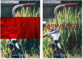 Een speelse folder van Tommy Hilfiger Childrenswear met een rood transparante banderol. De titel Easy Riders is pas leesbaar als de wikkel verwijderd is.