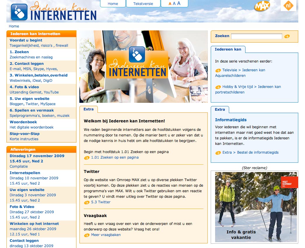 Omroep MAX zorgt ervoor dat zelfs senioren die nog steeds niet online zijn, aan het internetten slaan. Met een handig startboekje, veel hulplijnen en een website die aan alle accessibility richtlijnen voldoet. Dus met het smoesje dat de letters te klein zijn daar kom je niet meer mee weg. Iedereen kan internetten. Twitter ze!